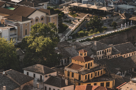 Aerial view of streets in the listed old town of Gjirokaster in southern Albania