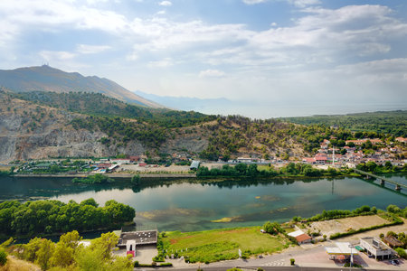 Picturesque view of the valley of the Buna River flowing into the Skadar lake near the city of Shkodra, Albania, seen from the Rosafa Fortres. Travel and tourism in the Balkans