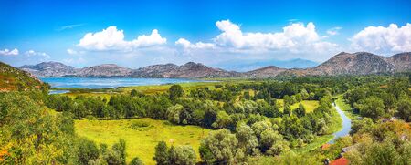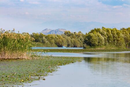 Montenegro Skadar Lake beautiful scenic coast national park panorama. Blue sky water reflection sunny outdoor Mediterranean summer wonderland background. European tourism vacation concept. High quality photo