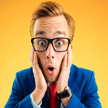 Unbelievable! Portrait of shocked or very surprised funny businessman with open mouth, in corporate style blue suit and red tie, over yellow-orange color background. Business concept.