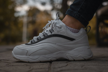 White sneakers on the feet of a girl in black jeans on the street
