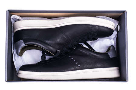 Men's fashionable gray leather sneakers, casual design. New pair of shoes unpacked from the box, shopping online, seasonal sales, men's shoe trends, box with sneakers at home