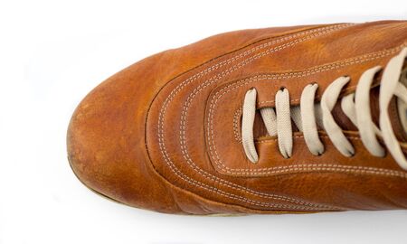 Old, leather shoes. Shabby, brown skin Tattered shoelaces Close-up