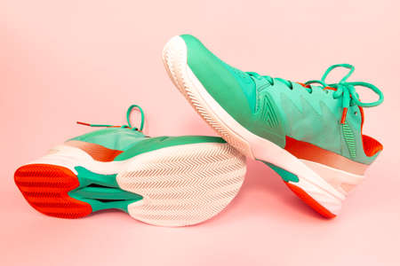 Red, cyan, white pair of new tennis shoes in studio isolated on a pink background.