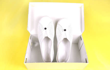 female white casual moccasins on pink yellow background, Stylish women`s slip on shoe. Summer urban outfit, vacation, sea trip concept