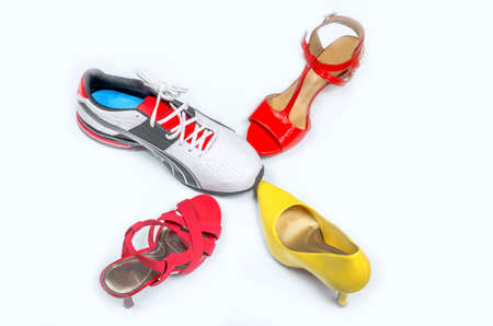 Variety of women's fashion comfortable shoes of all seasons on a light background, top view