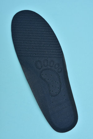 Foot support and healthy feet concept with orthopedic shoe insoles isolated color background