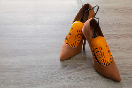 Pair of beautiful high heel shoes with modern electric footwear dryer on wooden background. Space for text