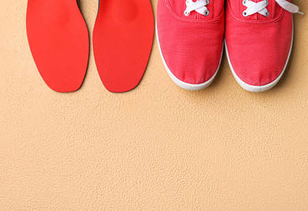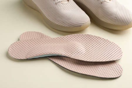 Beige orthopedic insoles and shoes on beige background
