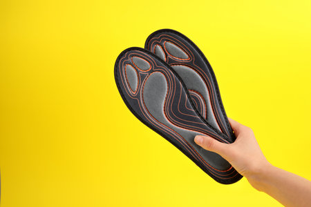 Woman holding pair of orthopedic insoles on yellow background, closeup. Space for text