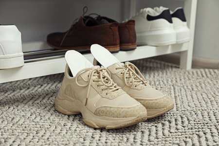 Orthopedic insoles in shoes on rug near rack, closeup