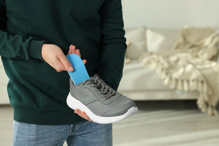Young man with flat feet inserting orthopedic insole into sneaker at home, closeup