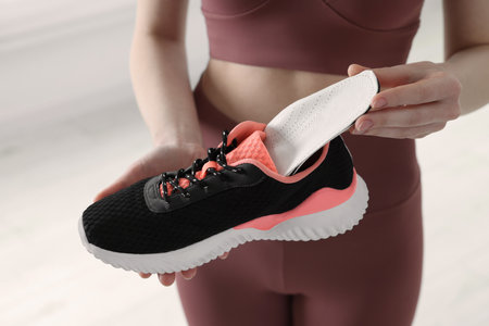 Woman putting orthopedic insole into shoe at home. Sports girl fitting orthopedic insole indoors, close up. Foot care banner. Flat Feet Correction. Treatment and prevention of foot diseases.