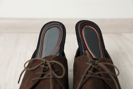 Orthopedic insoles in shoes on floor, closeup
