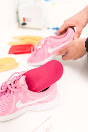 Orthopedic insole. The orthopedist works with the patient. Orthopedic clinic. Choice of insoles in an orthopedic clinic. The orthopedist offers the insole to the patient