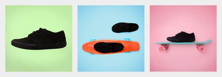 Trendy black skate sneakers with skateboard, street fashion and youth culture.