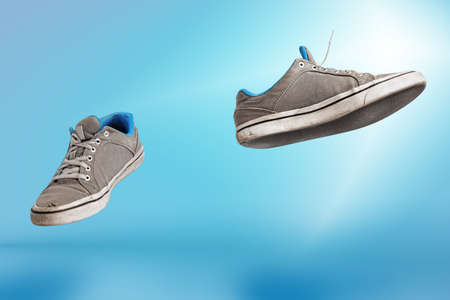Flying male shoes over blue background. Sneakers or trainers isolated. Athletic shoes. fitness, sport, training concept. Urban fashion