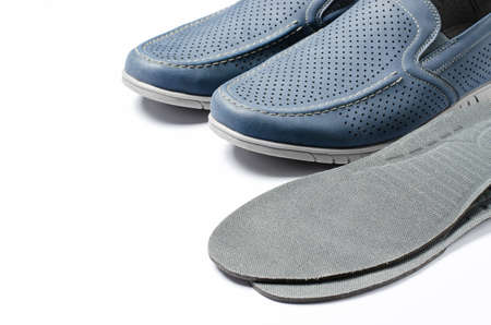 Orthopedic insoles and mens shoes. White background. The concept of prevention of diseases of the feet and flat feet. Comfort of wearing shoes