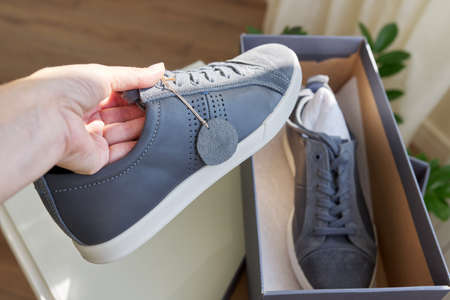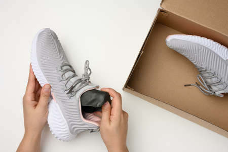 two female hands are holding a gray sports shoe over a white table, next to an open brown cardboard box. Inspection of online order