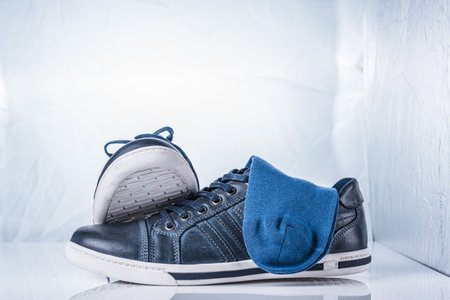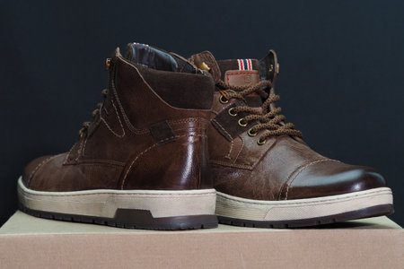 pair of leather sneakers stands on a cardboard box, blue background