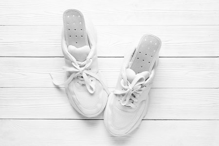 Pair of stylish sneakers with orthopedic insoles on light wooden background