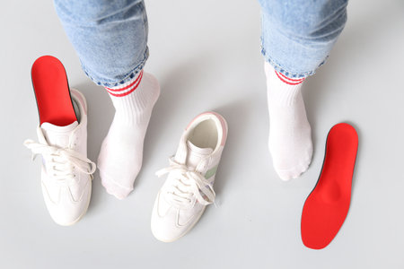 Female legs, orthopedic insoles and sneakers isolated on white background, closeup