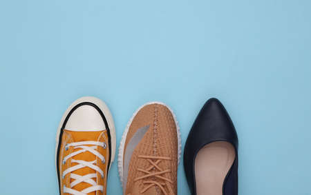 New colored sneakers for every day on a blue wooden background. Fashion footwear. minimal composition. Top view, flat lay.