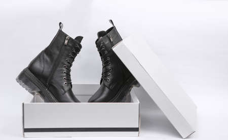 New Fashionable stylish leather female boots in box on white background.