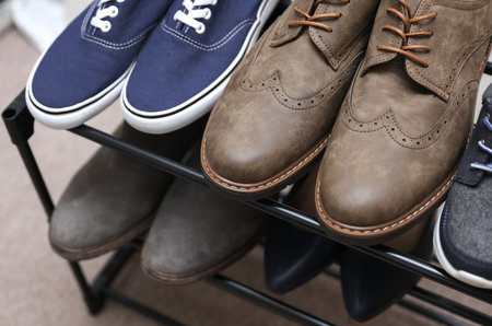 Metal shoe rack with shoes close up