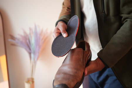 Man placing insoles into brown slip-on shoes at home