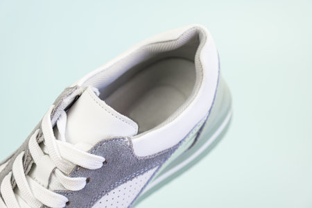 Sneakers for everyday use on a pale green background. Sneaker toe with suede and white leather with holes for air circulation. Summer footwear for sports, recreation, travel.