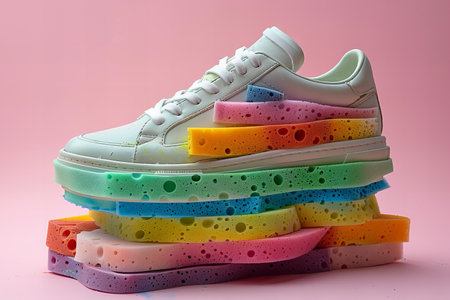 Sneakers and multicolored sponge on a pink background.