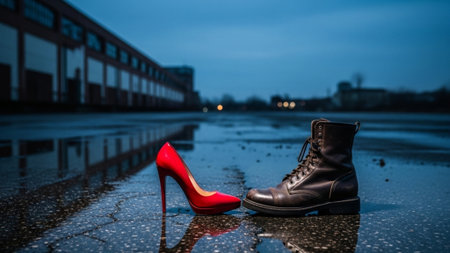This poignant image of abandoned shoes on a street evokes themes of economic hardship and loneliness, capturing the essence of struggle and resilience in urban life.