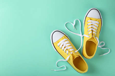 Pair of yellow sneakers on mint background