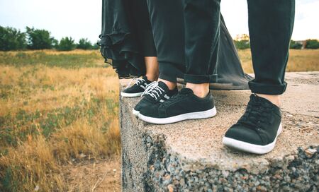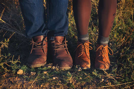Couple man and woman feet in love romantic outdoor with autumn season nature on background. Fashion trendy style