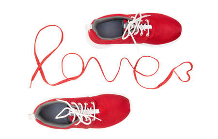 Red running sneakers and lettering love made of athletic shoelaces isolated on white background. Active lifestyle motivational concept.