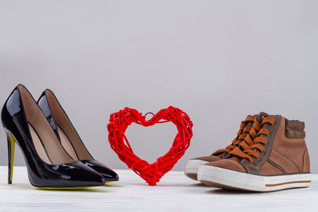 Pairs of mens and womens shoes with red heart. Black high heel shoes and brown sneakers on white background.