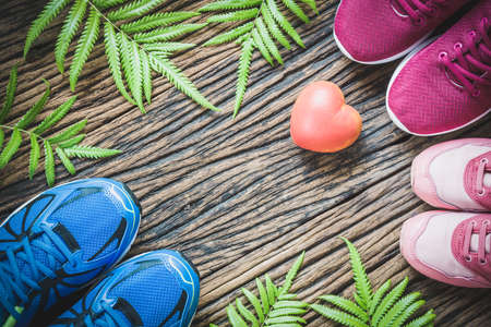 The healthy active lifestyle family concept, sport shoes, three pairs of dad, mom, daughter with heart shape