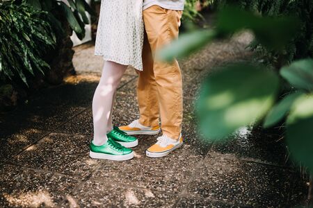 Summer romantic date. The legs of a woman and a man stand on a path made from cropped round arches. View from above