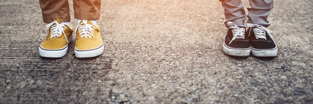 Young persons wearing colorful sneakers and jeans outdoors with copy space - Trendy canvas shoes on the sidewalk - People with casual footwear and denim pants