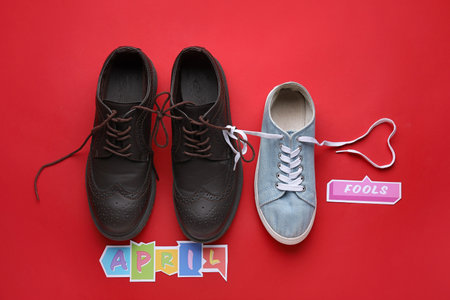 Different shoes with tied laces on color background. April Fool's Day prank