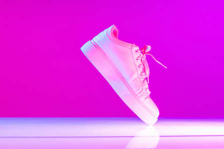 Closeup female sports shoes, sneakers isolated over neoned background. Urban city fashion, fitness, sport, training concept.