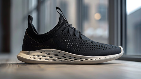 Stylish Black Athletic Shoe Displayed on a Wooden Surface Near a Large Window During Daylight Hours. Generative AI