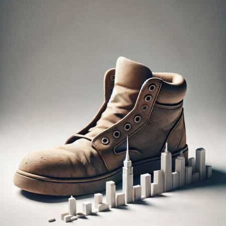 An individual's work boot balances on a metal girder with 2026 painted on it, overlooking a sprawling metropolis during a vibrant sunset, representing upcoming goals and urban expansion.