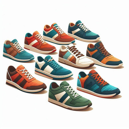 A visually appealing array of sneakers arranged neatly on a wooden floor, highlighting their various colors and styles, perfect for showcasing casual footwear choices.