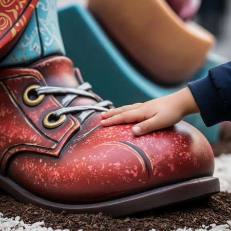 Close-up of a child's hand touching the colorful, textured base of a towering Ninot sculpture during the Las Fallas festival in Spain.