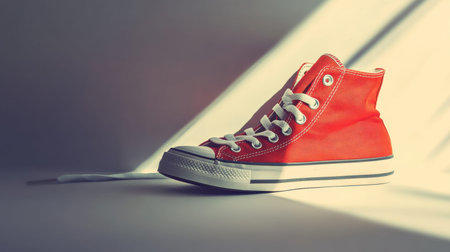 This vibrant red high-top sneaker, set against a subtle shadow backdrop, captures the essence of casual fashion and youthful energy. Ideal for trendy designs.