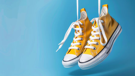 Yellow sneakers hanging by their laces against a blue background with a clean, minimalist look