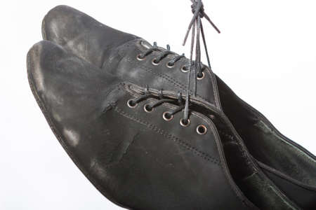 Old shoes hang on laces on a blurred background.