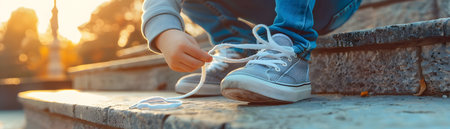 Child tying shoelaces on a school step in the early morning with soft light emphasizing their focus and determination as they get ready for the day ahead